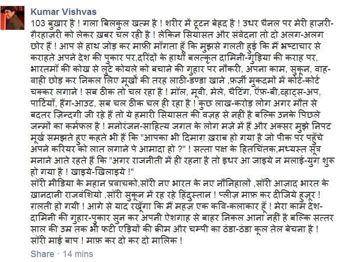 ट्विटर पर देखी - एक मनोरंजक पोस्ट : कुमार विश्वास जो अभी- अभी अमेठी से हार के आये हैं, कुछ ऐसा सोच रहे हैं. (जून ७, २०१४)